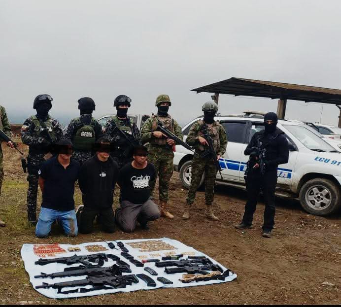 En Camilo Ponce Enríquez (Azuay), la Policía Nacional y las Fuerzas Armadas ejecutaron un operativo conjunto en el sector La Tormenta, donde se hallaron indicios relacionados con tenencia ilegal de armas. Como resultado, tres personas fueron aprehendidas —una de ellas vinculada a un caso de asesinato— y se decomisaron cinco armas de fuego (tres escopetas tipo fusil y dos subfusiles), más de 500 cartuchos, radios portátiles y varios celulares. Las autoridades reforzaron estas intervenciones como parte de las acciones contra la minería ilegal y delitos asociados.