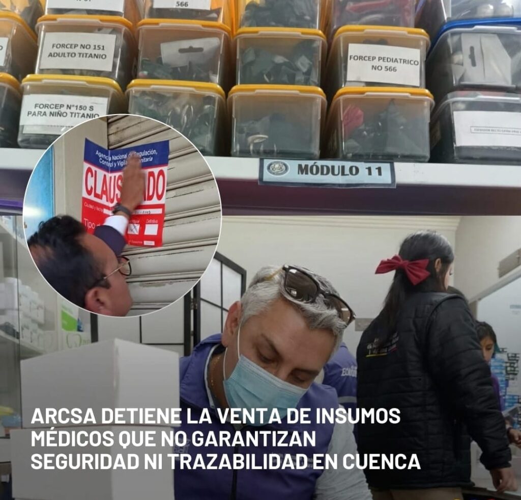 En una inspección de rutina, técnicos de la Agencia Nacional de Regulación, Control y Vigilancia Sanitaria (Arcsa) procedieron a la clausura de una comercializadora de dispositivos médicos en Cuenca, provincia del Azuay, tras verificar la oferta y almacenamiento de dispositivos médicos sin registro sanitario.